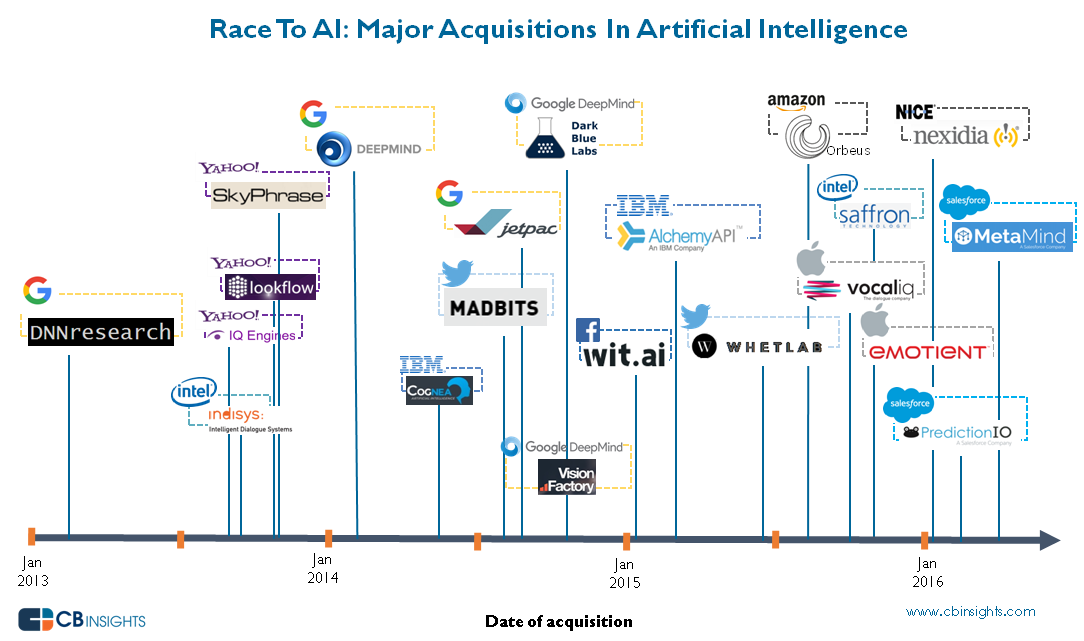 Link The Race For AI: Google, Facebook, Amazon, Apple In A Rush To Grab Artificial Intelligence Startups by CB Insight Over 60% of the AI companies acquired in the last 3 years had VC backing. There have been 4 major acquisitions already in 2016. Share this:Share Click to share on X (Opens in new window) X Click to share on Facebook (Opens in new window) Facebook Click to share on LinkedIn (Opens in new window) LinkedIn Click to share on Pinterest (Opens in new window) Pinterest Click to share on Reddit (Opens in new window) Reddit Click to share on Tumblr (Opens in new window) Tumblr Click to print (Opens in new window) Print Click to email a link to a friend (Opens in new window) Email Like Loading... Related